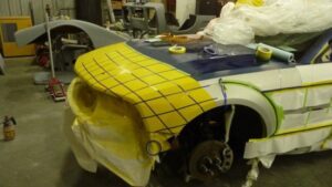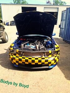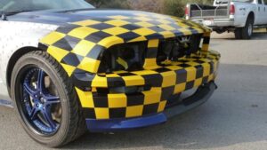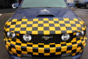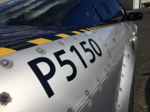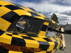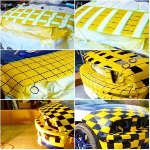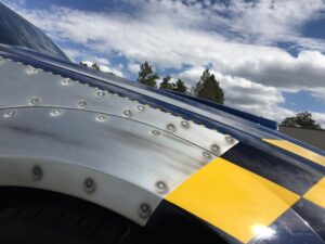 Each rivet and bullet is hand airbrushed to give the effect of the aluminum skin from the original planes. The front bumper process took an entire 30-40 fine line 3M rolls for masking to achieve the perfect checkered pattern.