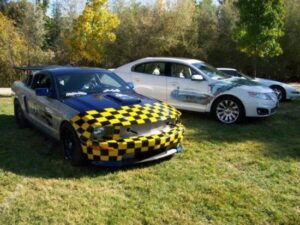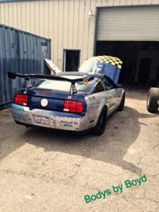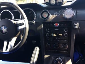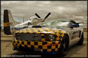 This unique GT Mustang has a modified engine with 550 HP, a custom built roll cage with race seats fabricated to match logo, personally signed dash by Jack Roush, two mock machine guns to replicate the fighter planes, and of course killer paint!